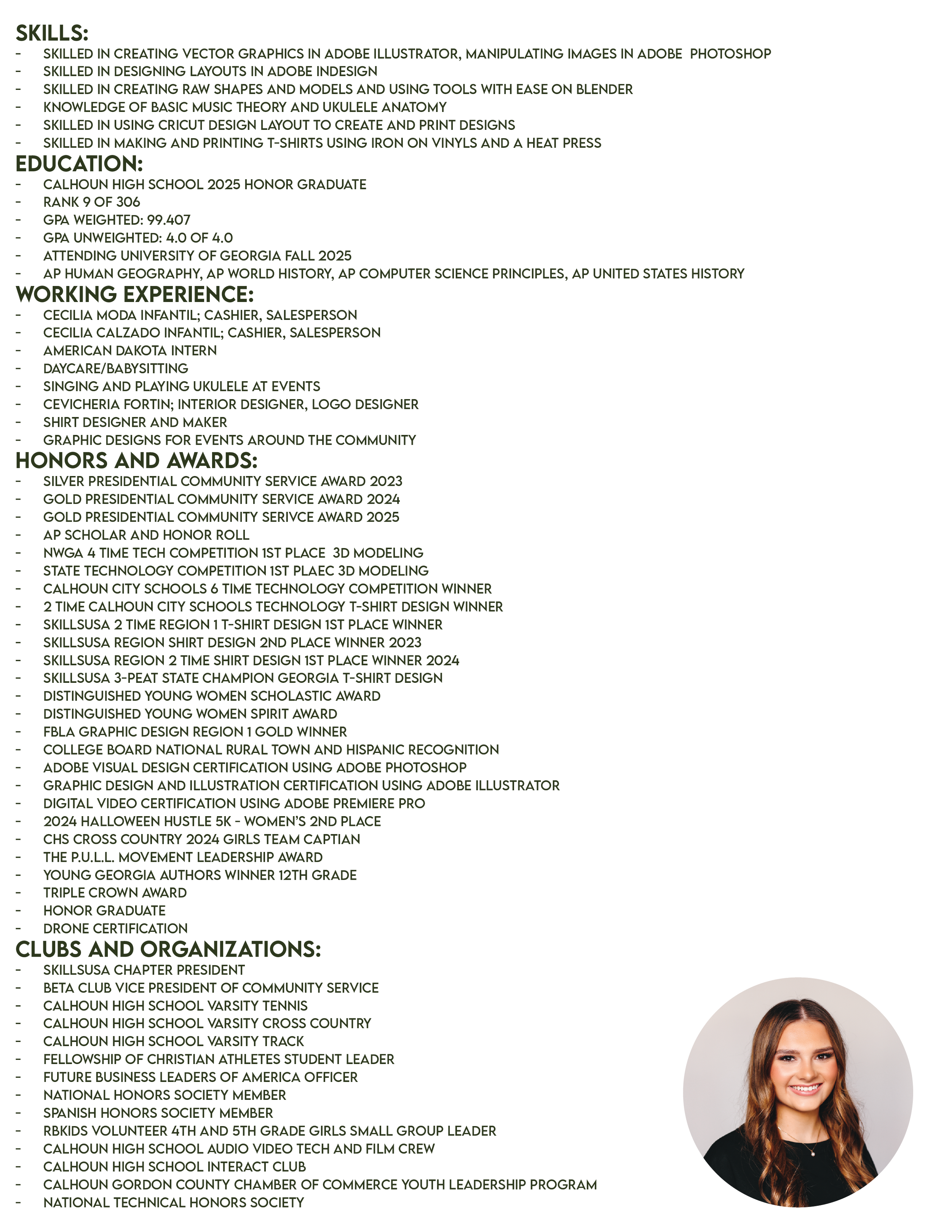 I'm Sara Elise Gallman, and I'm currently a freshman at the University of Georgia, located in Athens, Georgia. I am a fifth-year graphic design student with certifications in Adobe Illustrator, Photoshop, InDesign, and Premiere Pro. I am also skilled in Adobe After Effects with creating motion graphics, skilled in creating 3D models in Blender, and printing designs using Cricut Design Space. I have my own business, SE Designs, through which I have sold merchandise to individuals, sports teams, and businesses. For more information, please contact me at saraelise.design@gmail.com